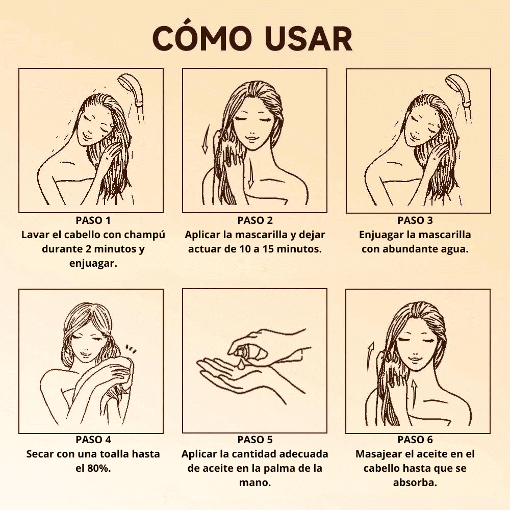 ✔ Para un tratamiento más profundo, usar gorro térmico o aplicar calor suave.