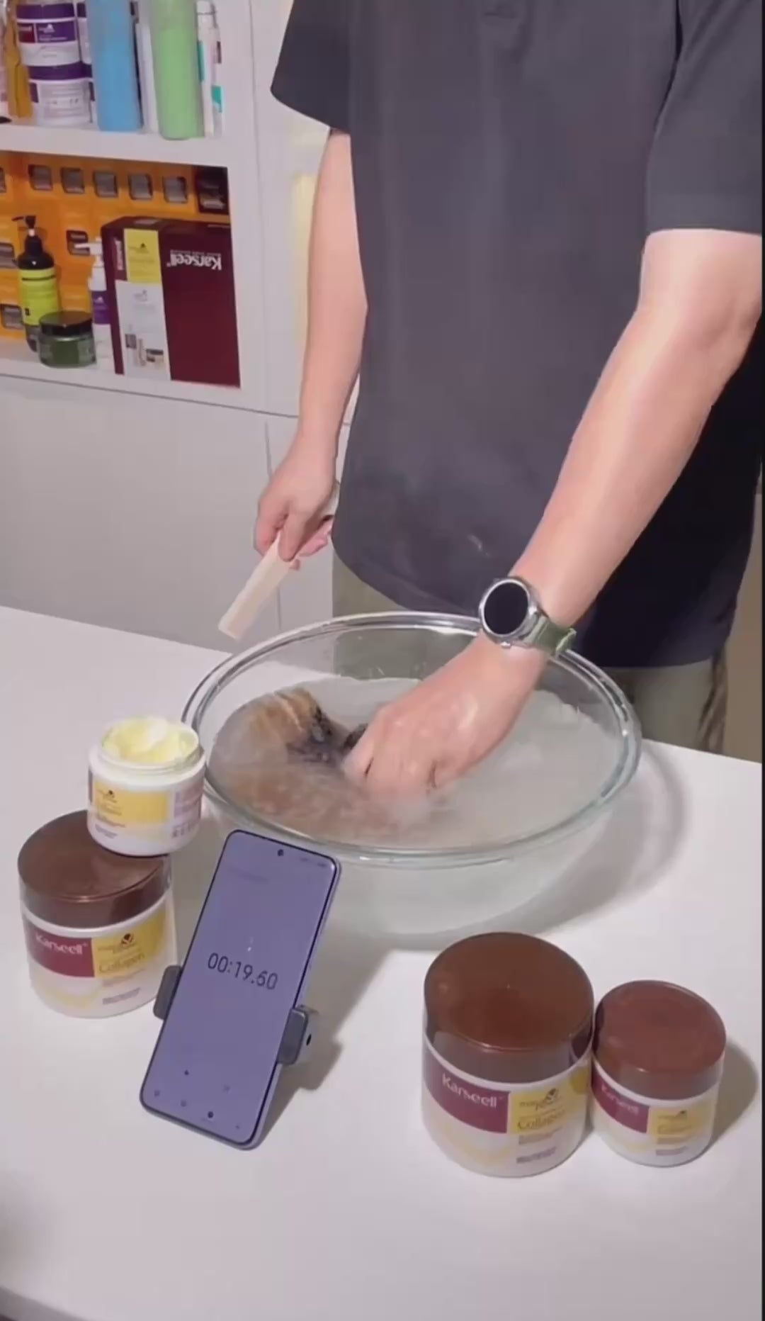 Masajear suavemente y dejar actuar entre 5 y 15 minutos (hasta 20 minutos si el cabello está muy dañado).