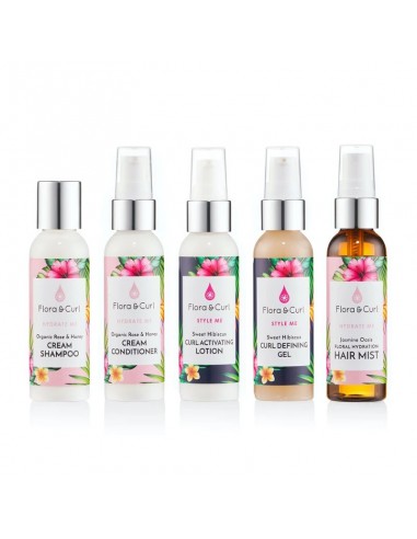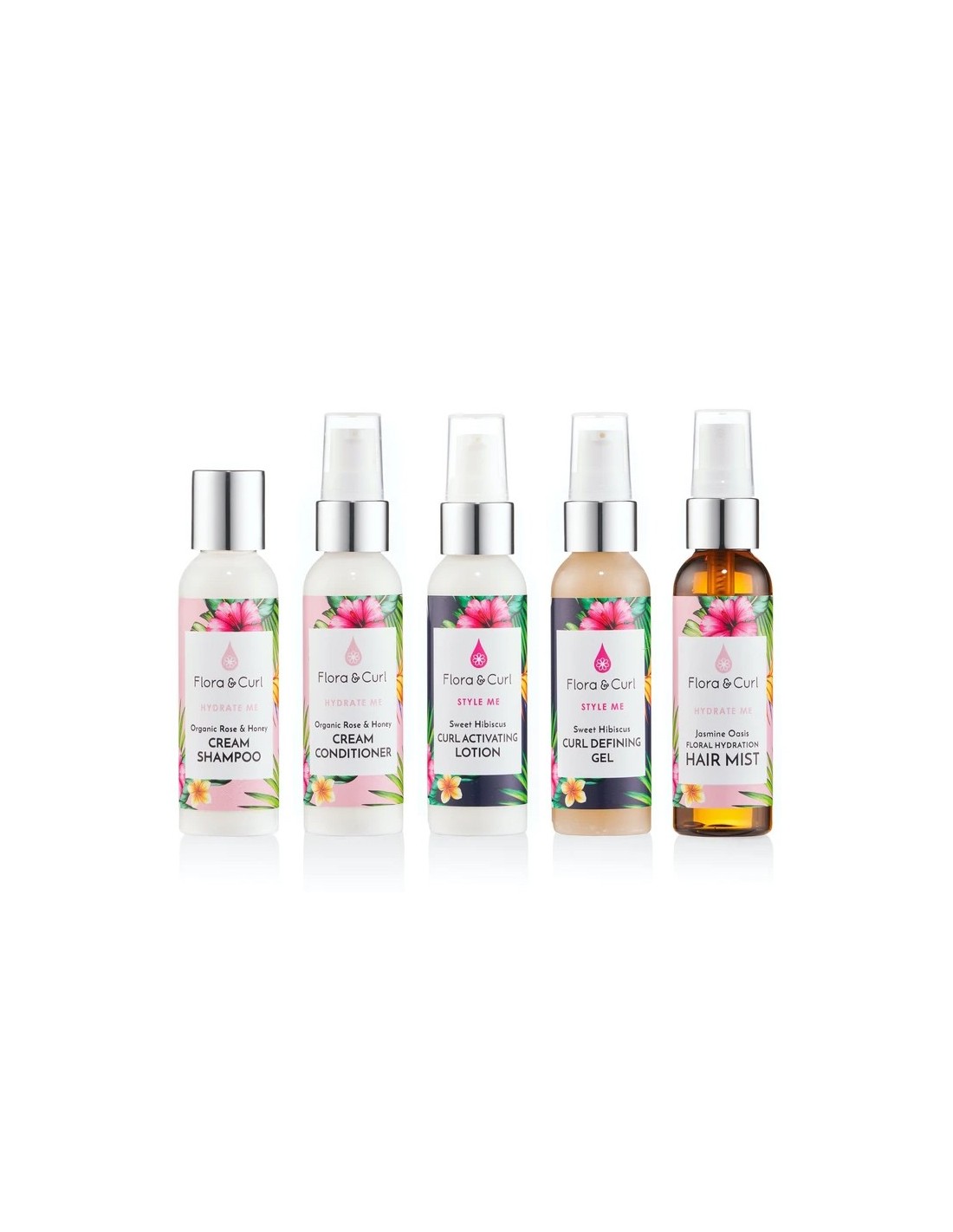 Kit de viaje con 5 productos esenciales para mantener los rizos hidratados, en forma y definidos cuando se está fuera de casa.