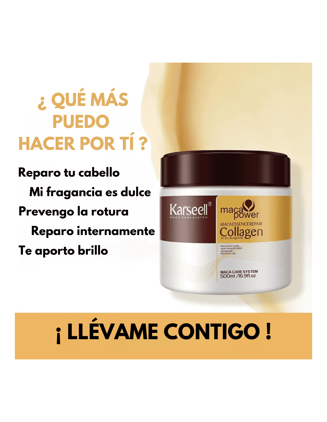 Mascarilla intensiva con colágeno hidrolizado y extracto de maca para cabello seco, dañado o tratado químicamente. Formato 500ML. Restaura la elasticidad, hidrata y fortalece desde la primera aplicación.